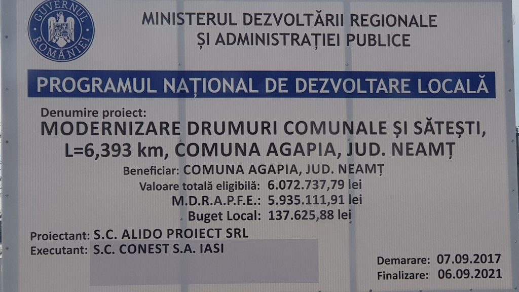 Execuția lucrărilor pentru proiectul „Modernizare rețea de drumuri sătești L=5,277 Km, comuna Agapia”, finanțat cu fonduri europene prin Programul Național de Dezvoltare Rurală (PNDR), a avut o valoare estimată de 4.207.066 lei (fără TVA). În cursa pentru câștigarea lucrării (procedură simplificată pe SEAP) s-au înscris șapte societăți, oferta câștigătoare fiind cea a Conest SA Iași, cu o valoare de 3.792.515 lei (fără TVA). Contractul a fost atribuit în data de 12 februarie 2018. Oferte au mai depus Aqua Parc SRL, Darcons SRL, Trust CCDP, Autotenorom, Newamport Asfalt SRL și Citadina 98 SA. Doar două oferte au fost admise, a celor de la Conest și a celor de la Citadina 98. Cum oferta celor din urmă a fost mai mare decât cea a Conest SA, firma ieșeană a fost declarată câștigătoare.