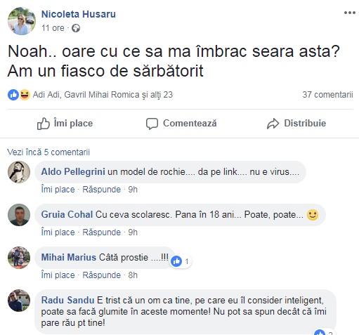 Nicolea Husaru (FOTO), consiliera de imagine a inculpatului Ionel Arsene, președintele Consiliului Județean Neamț, poreclit și „Șosetă”, după episodul de acum câțiva ani când a apărut într-un filmuleț deoecheat, a fost plină de ironii la adresa celor care, aseară, au protestat la București împotriva găștii Dragnea. Lăsând la o parte faptul că Husaru nu face altceva decât să se îngrijească de imaginea inculpatului Arsene, care păstorește una dintre cele mai corupte instituții din județ, fără ca nimeni să vadă asta, aroganțele postate pe o rețea de socializare despre protestul Diasporei arată caracterul infect al unora dintre cei plătiți regește din bani publici. Să dai „mulinițe, mulinițe” din poziția de mare creator de imagine este degradant, în primul rând, pentru tine ca femeie, ca mamă, dar și pentru tine ca reprezentant al unei instituții publice.