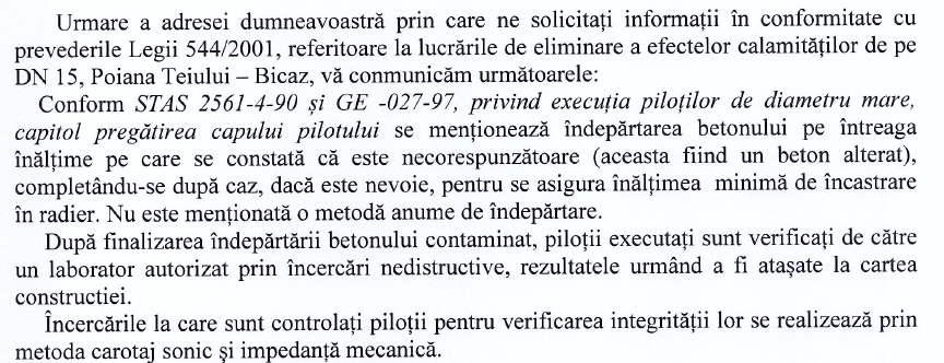 „Conform STAS 2561-4-90 și GE 027-97, privind execuția piloților de diametru mare, capitol pregătirea capului pilotului se menționează îndepărtarea betonului pe întreaga înălțime pe care se constată că este necorespunzătoare (aceasta fiind un beton alterat), completându-se după caz, dacă este nevoie, pentru a se asigura înălțimea minimă de încastrare în radier. Nu este menționată o metodă anume de îndepărtare (…)”.