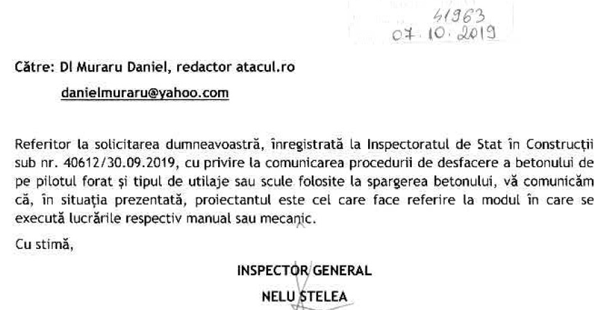 Inspectoratul de Stat în Construcții a fost și mai scurt, precizând că proiectantul este cel care stabilește modul în care se execută lucrările, manual sau mecanic. De aici tragem concluzia că, în cazul în care proiectantul consideră că poate folosi dinamită ca să descopere capetele piloților, o poate face fără problemă, el fiind cel care decide.