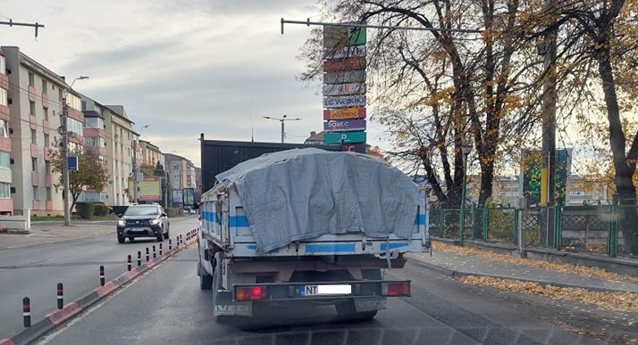 În fotografia de mai jos avem o camionetă încărcată cu lemn, surprinsă azi dimineață în orașul Piatra-Neamț, la ora 10.51.