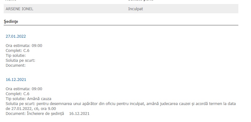 Penultimul termen al procesului s-a judecat pe 17 decembrie, când magistrații au fixat următoarea întâlnire pentru data de 12 ianuarie, adică după 26 de zile.