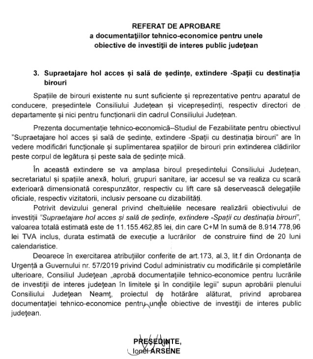 În referatul de aprobare a documentațiilor tehnice, Ionel Arsene explică necesitatea investiției în noi birouri. Astfel, spune Ionel Arsene, „spațiile de birouri existente nu sunt suficiente și reprezentative pentru aparatul de conducere, pentru președintele Consiliului Județean și vicepreședinți, respectiv pentru directorii de departamente și nici pentru funcționarii din cadrul Consiliul Județean”. Adică, cei din CJ muncesc în condiții dificile, pentru că spațiile nu sunt suficiente și nici reprezentative pentru ditamai funcționarii.