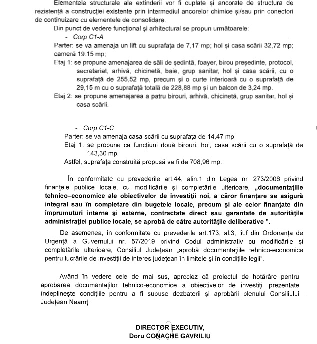 În raportul de specialitate, Doru Conachi, director executiv în CJ, face o descriere succintă a investiției dorită. Și el confirmă că principalul beneficiar al investiției de peste 2 milioane de euro este Ionel Arsene.