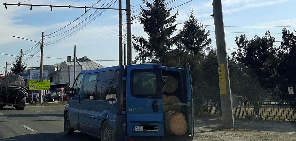 Ieri după amiază, la ieșirea din Piatra-Neamț spre Dumbrava Roșie, autovehicului din imagine, un Renault Trafic pentru transport persoane, era plin cu … bușteni de brad. Pentru siguranță, ușile din spate au fost legate cu o sfoară. Mai mult decât atât, pe o banchetă situată în spatele șoferului se aflau doi tineri care ar fi putut suferi răni grave dacă conducătorul auto ar fi frânat brusc.