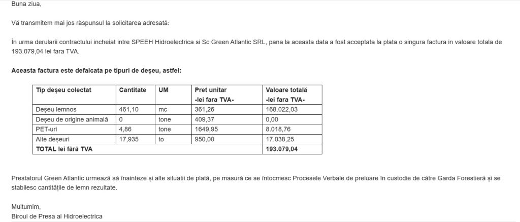 Până în acest moment, Hidroelectrica a acceptat la plată o singură factură în valoare de 193.079 lei, fără TVA. Pentru acești bani, firma vrânceană a scos 461,1 mc deșeu lemnos, pentru care a primit 168.022 lei, fără TVA, 4.860 kilograme de deșeuri plastice – pentru care a încasat 8.018, 76 lei și 17.935 kg „alte deșeuri”, pentru care a încasat 17.038 lei, fără TVA.