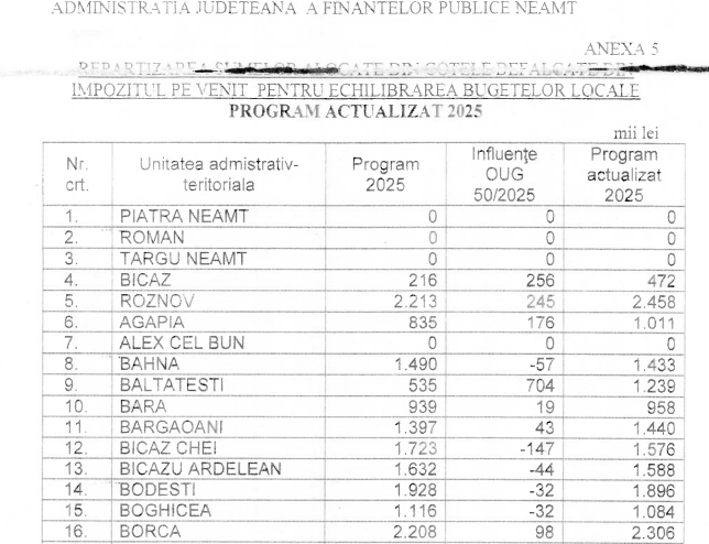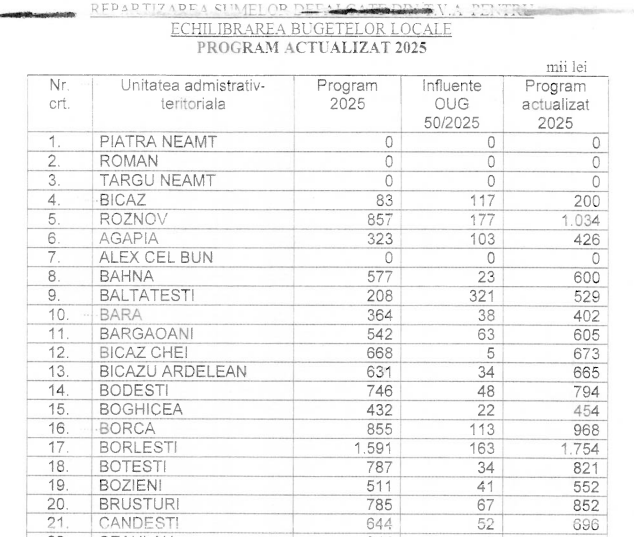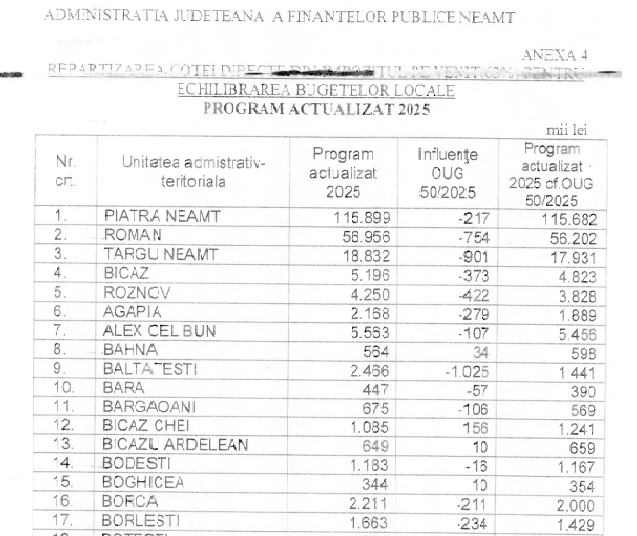Ieri, șeful Administrației Județene a Finanțelor Publice Neamț, Daniel Kudera, a emis decizia privind repartizarea sumelor defalcate din TVA și a sumelor alocate din cotele defalcate din impozitul pe venit pentru echilibrarea bugetelor locale ale comunelor, orașelor și municipiilor din județului Neamț, pe anul 2025. Repartizarea pe unități administrativ teritoriale a sumelor pentru echilibrarea bugetelor locale a fost realizată în contextul rectificării bugetului de stat pe anul 2025, consfințită de OUG 50/2025.