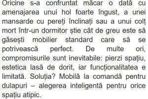 Dacă locuiești într-o casă sau un apartament cu spații atipice, înguste sau greu de mobilat, mobilierul la comandă pentru dulapuri este cea mai bună investiție pe care o poți face. Ai parte de un design personalizat, soluții inteligente de depozitare și un rezultat final care se potrivește perfect stilului și nevoilor tale.