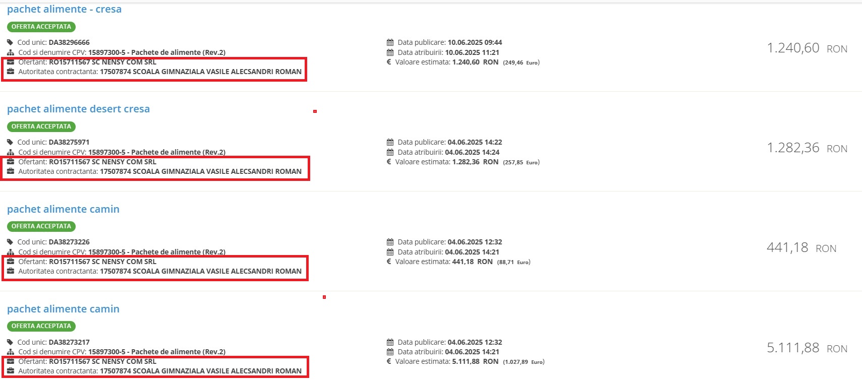 În 2025, Școala „Vasile Alecsandri” a încheiat numai pe SEAP 95 de contracte cu firma Nensy Com SRL, achizițiile fiind făcute de Camelia Ciocan. Vorbim despre sute de mii de lei, bani plătiți pentru produse alimentare și nu numai, pentru că Nensy Com SRL a vândut și alte produse școlii la care lucra administratoarea: farfurii pentru creșă, detergenți, ustensile de bucătărie.