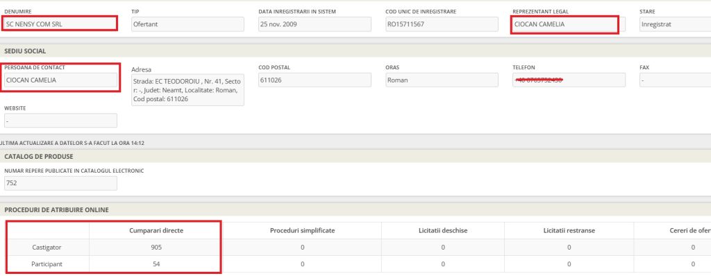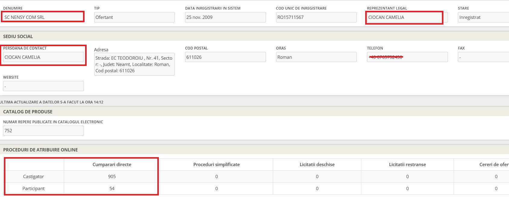 Pe platforma sistemului electronic de achiziții publice, Camelia Ciocan figurează ca reprezentant legal și persoană de contact pentru firma Nensy Com SRL.