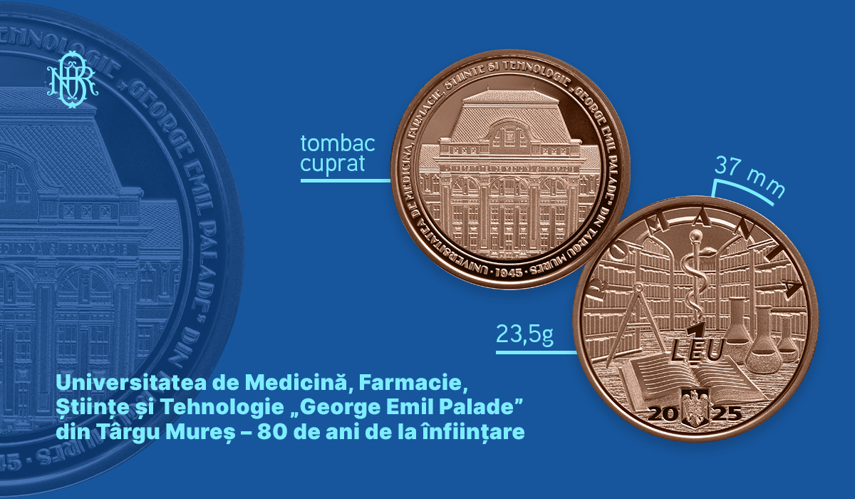 Astăzi, 17 noiembrie, Banca Națională a României (BNR) lansează în circuitul numismatic o monedă din tombac cuprat cu tema „Universitatea de Medicină, Farmacie, Științe și Tehnologie „George Emil Palade” din Târgu Mureș – 80 de ani de la înființare”.