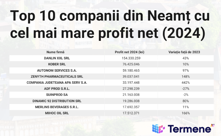 Termene.ro a realizat un top al celor mai profitabile companii din județul Neamț, după valoarea profitului net realizat în anul 2024, potrivit unei analize din seria Top 50 by Termene Business Hub.
