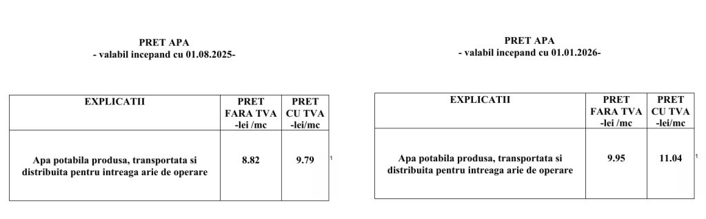 În ceea ce privește prețul apei potabile, cele mai mari prețuri sunt la Vaslui (12,32 lei/mc), la Bacău (11,25 lei/mc) și la Alexandria (10,88 lei/mc), toate fără TVA.