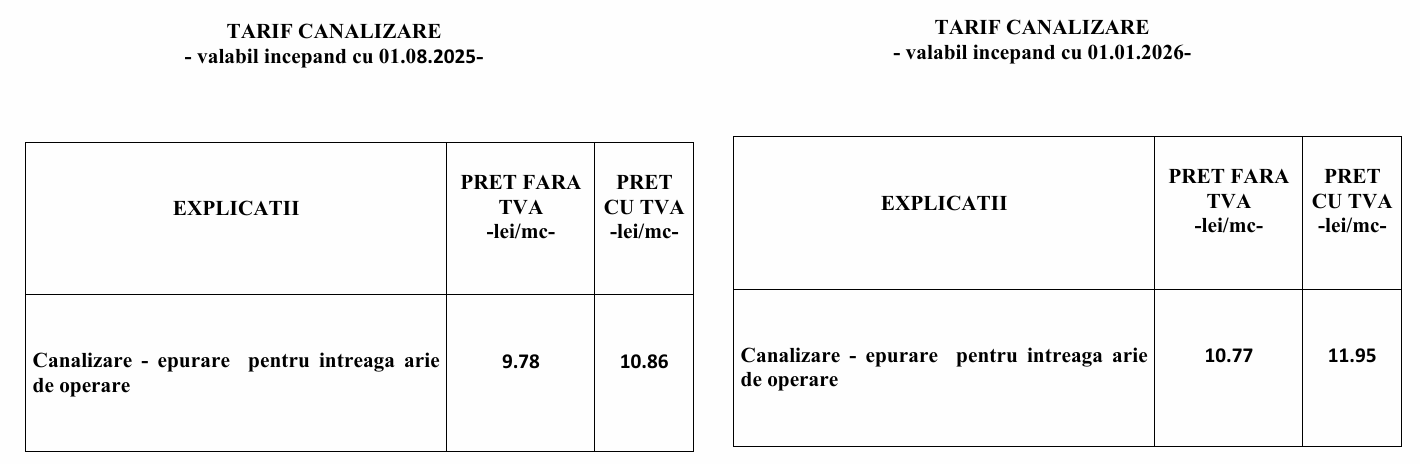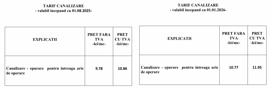 Serviciul de canalizare – epurare costă, din 1 ianuarie 2026, 10,77 lei/mc, fără TVA, mai mult cu 0,99 lei față de anul trecut, când s-a situat la valoarea de 9,78 lei. Cu TVA, prețul serviciului de canalizare – epurare este de 11,95 de lei/mc.