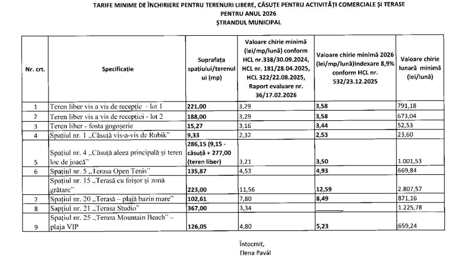 Regimul economic. Având în vedere faptul că prin HCI. nr. 338 din 30.09.2024, HCL nr. 181 din 28.04.2025 şi HCL nr. 322 din 22.08.2025 s-a aprobat prețul minim al închirierii pentru spațiile şi terenurile situate în incinta Ştrandului Municipal Piatra-Neamt, iar acestea se vor indexa cu 8.9%, conform HCL nr. 532 din 23.12.2025, se garantează UAT-ului obținerea unui venit minim aproximativ de 26.302,86 lei în condițiile în care gradul de închiriere este de 100%, cu o durată contractuală de 3 luni”, potrivit studiului de oportunitate.