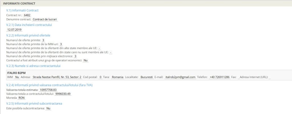 În urma analizării ofertelor, a fost declarată câștigătoare cea a asocierii Italro B2PM SRL (patru asociați, trei italieni și o firmă din Italia) – Simeone SPA Italia, suma avansată fiind de 9.996.030 de lei, fără TVA. Ulterior, prin acte adiționale, valoarea contractului a crescut la 11.036.889 lei, fără TVA.