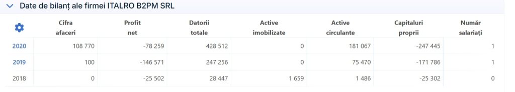 În anul 2020, când apare ultimul bilanț, Italro B2PM SRL a avut o cifră de afaceri de 108.770 lei, o pierdere de 78.259 de lei și datorii de 428.512 de lei, pe care ne îndoim că Fiscul le-a recuperat.