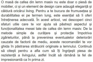 Întreținerea corectă a unei mese de cafea din lemn masiv este esențială pentru a-i prelungi viața și pentru a-i păstra frumusețea naturală. Din curățarea regulată cu produse potrivite și amplasarea strategică pentru a evita deteriorarea culorii, până la protejarea suprafețelor de zgârieturi și folosirea constantă a soluțiilor de protecție, fiecare pas contribuie la menținerea unui aspect impecabil și a durabilității lemnului. Adoptând aceste practici, masa ta va continua să fie un element central și apreciat al livingului tău.