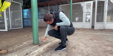 Primarul Niță, la demolarea pieței, ciocănind un stâlp metalic din structura imobilului. A ruginit, n-a ruginit…