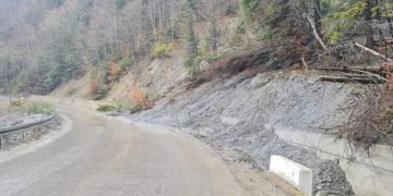 FOTO. Axialul o ia la vale. O porțiune de drum, acoperită de pământul ce alunecă ...
