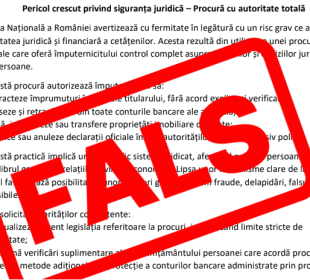 Documentul „Pericol crescut privind siguranța juridică – Procură cu autoritate totală” este un fals